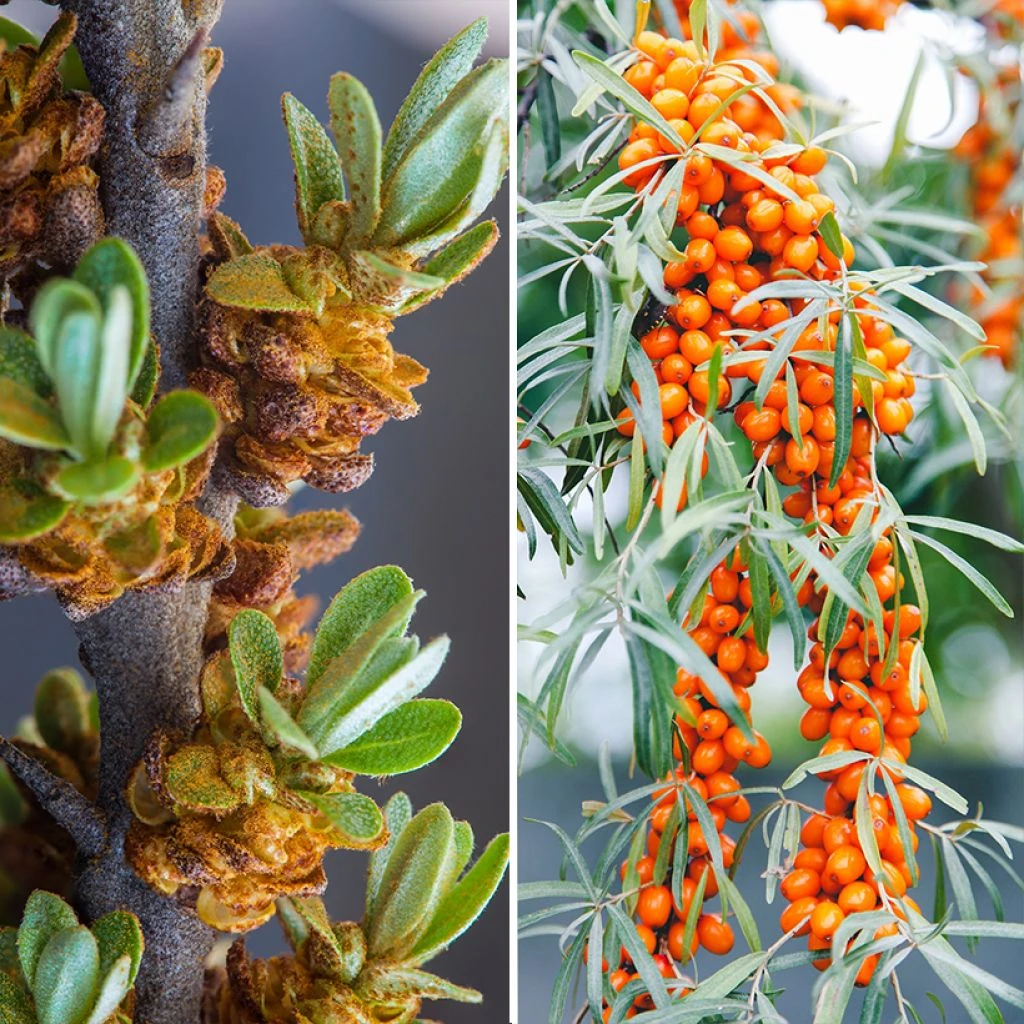 1 x Hippophae rhamnoides Leikora : plant femelle à fruits orangés de 6 à 8 mm de diamètre, arrondis, de couleur jaune orangé, de saveur acidulée. Réputées pour leur teneur en vitamines et en anti-oxydants, ces argouses se consomment sous forme de compotes, confitures, sirops ou gelées. Elles sont également utilisées en cosmétique, sous forme d’huile, extraite des pépins et de la pulpe. Cette sélection allemande est très répandue en Europe et Amérique du Nord.
