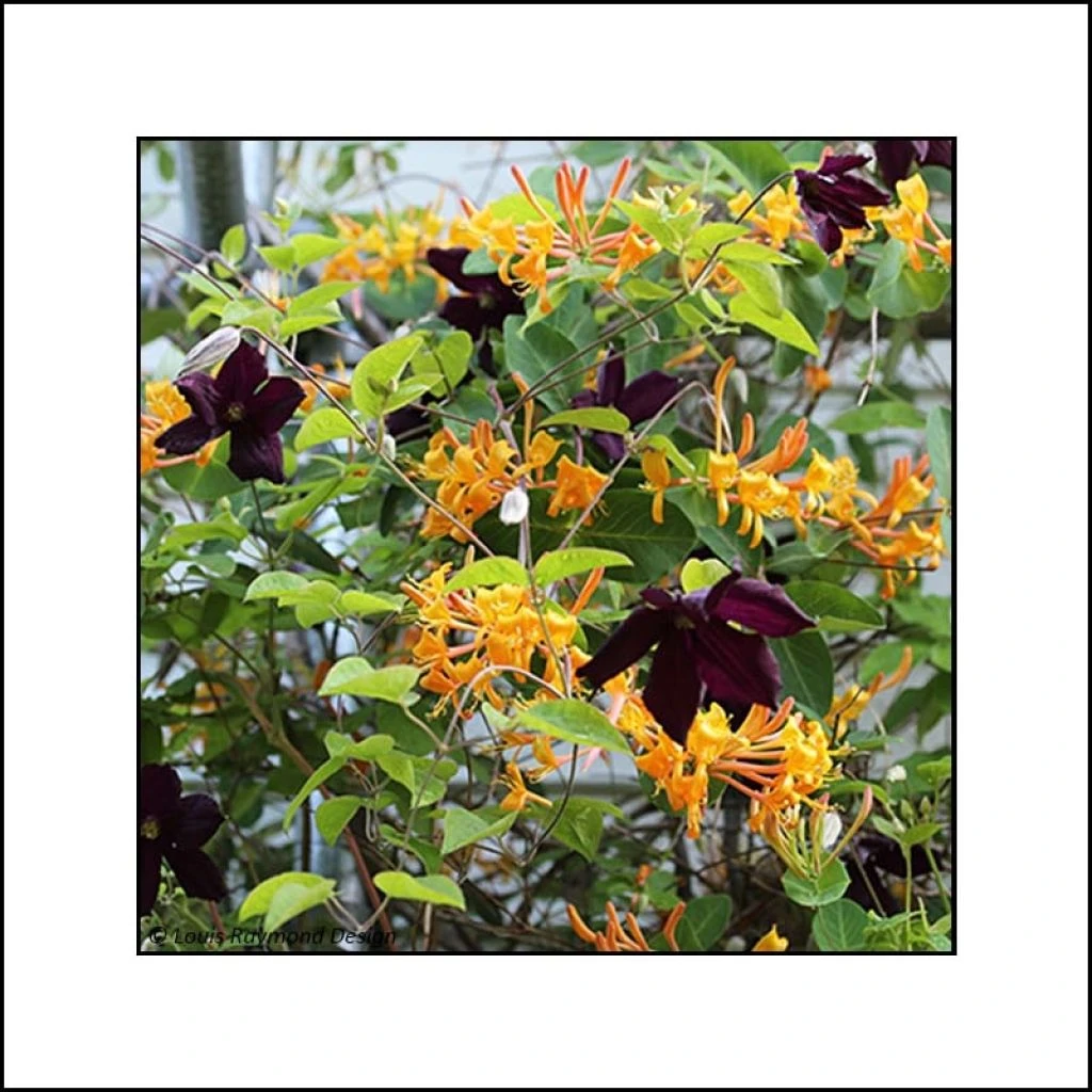 Un duo aux couleurs redoutables ! Les fleurs orange et jaunes du Lonicera Mandarin® côtoient les sombres inflorescences pourpres de la Clématite Romantika. Ce duo merveilleusement contrasté réunit deux grimpantes volubiles originales et vigoureuses, garnies d’un feuillage caduc décoratif et de fleurs estivales parfumées. Leurs longues tiges s’enroulent sur tout support mis à leur disposition. Ces lianes couvriront ensuite avec enthousiasme une pergola, une tonnelle, ou partiront à l’assaut d’une vieille haie un peu triste…
