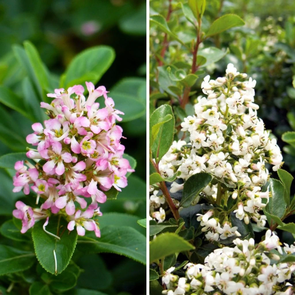 Ce Duo Escallonias réunit deux excellentes variétés d’Escallonia hybrides idéales pour découvrir ces arbustes persistants de climat doux parfaitement adaptés au bord de mer. ‘Iveyi’ est un vigoureux arbuste de haie qui produit des fleurs blanches légèrement parfumées, tandis que ‘Pink Elle’, au développement réduit et aux fleurs roses, est une plante « déco », facile à modeler, parfaite dans un joli pot sur la terrasse ou dans un massif bas. Culture au soleil ou à mi-ombre, dans tout sol drainé pas trop calcaire.