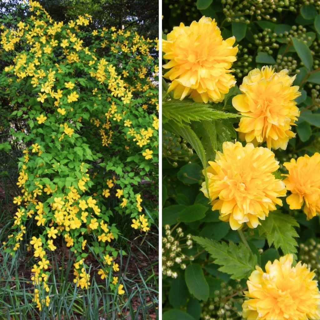 1 Kerria Japonica ‘Pleniflora’ : cette variété atteint entre 1,5 m et 2 m de hauteur pour une envergure à peu près similaire. Ses fleurs doubles, en pompons, sont d’un jaune profond. Elle fleurit abondamment au printemps, dès mars.